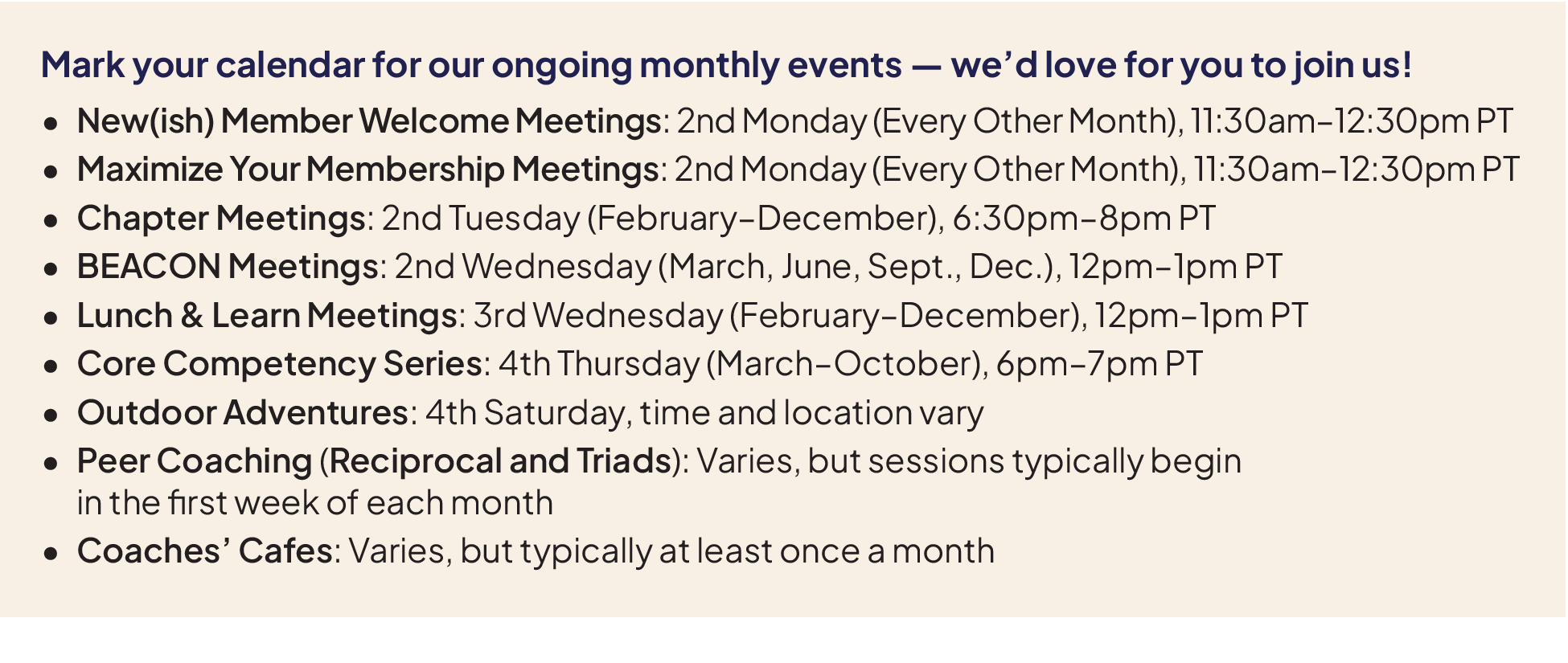 Next Monday, March 9 from 11:30am–12:30pm PT, we invite our new(ish) members to join us for a virtual welcome meeting. This is a great place to meet other coaches, share thoughts, and ask questions about membership, our chapter, or coaching in general. You’ll meet different people each time you attend, so join as many times as you like! REGISTER HERE.